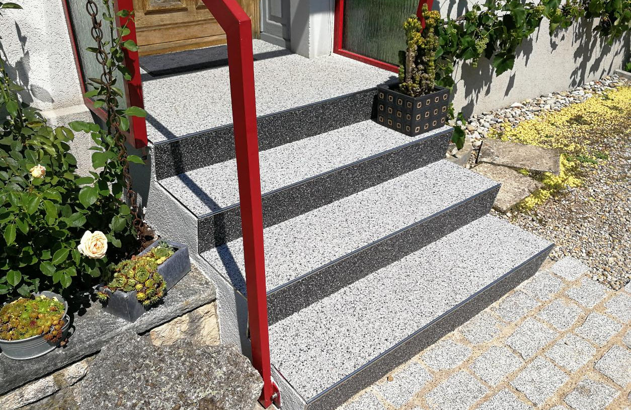 Wollen Sie Ihre Aussentreppe renovieren? Unser Treppenrenovierungskonzept ist im Innen- und Aussenbereich anwendbar. Frostschäden, abgelöste Beläge, und Ausbrüche an der Grundsubstanz müssen beseitigt und wieder aufgebaut werden. Sofern eine Abdichtung notwendig ist, wird die Treppe mit Flüssigkunststoff oder einer zementösen Dichtschlämme abgedichtet. Ist die Treppe soweit wieder in Stand gesetzt, wird der Steinteppich als Deckbelag aufgetragen. Treppensockel können stufig oder schräg ausgeführt werden, Wangen verkleidet und Podeste passend zum Treppenbelag gestaltet werden.